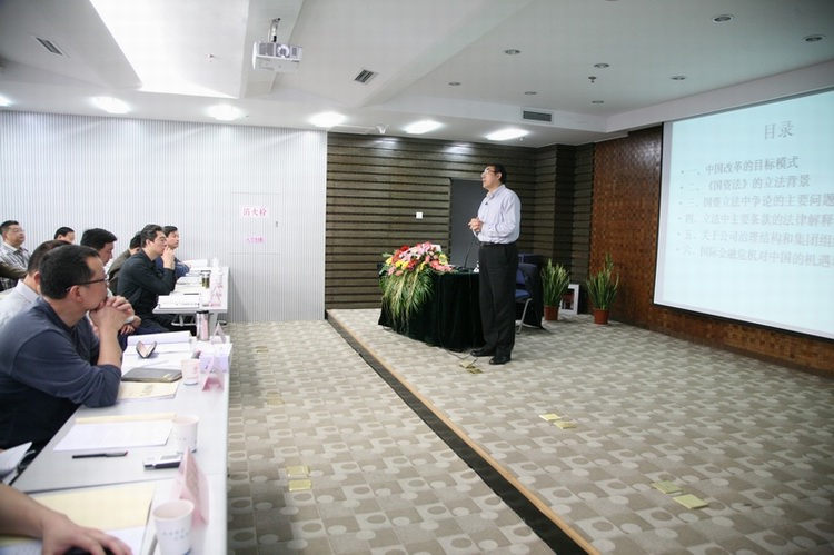 劉紀(jì)鵬教授對中國改革的目標(biāo)模式、國資改革中的政府定位、《國有企業(yè)資產(chǎn)法》的立法背景、立法中爭論的主要問題、主要條款的法律解釋等問題做了深入的講解,并對參會人員提出的疑問做了認真的解答。此外,他還就國際金融危機對中國發(fā)展的機遇和挑戰(zhàn)提出了自己的獨到見解。