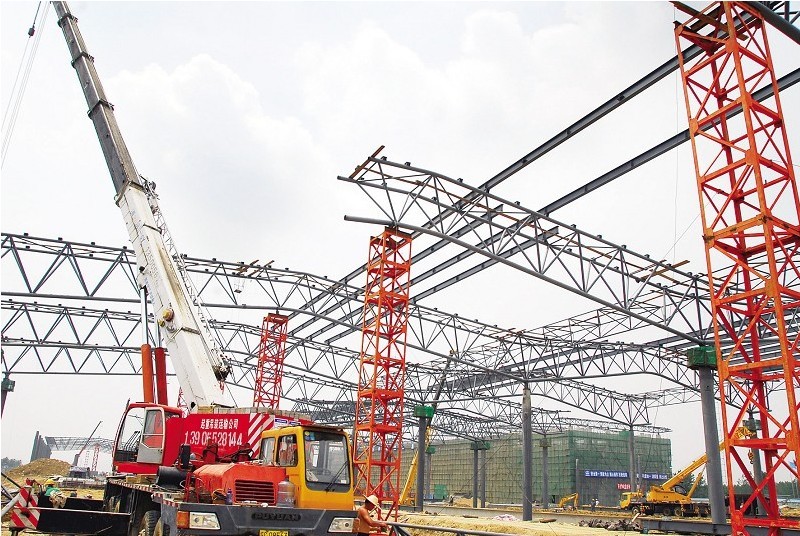 7月2日,施工人員正加緊吊裝京滬高鐵蚌埠站站臺鋼架結(jié)構(gòu)雨棚。作為京滬高鐵全段較大的客站蚌埠站站房工程,目前建設(shè)速度不斷加快,預(yù)計今年9月前站房全部竣工、交付使用。按照列車運行規(guī)劃,2015年停靠列車40對,2020年停靠列車73對。記者 郭雷 通訊員竇凱 攝