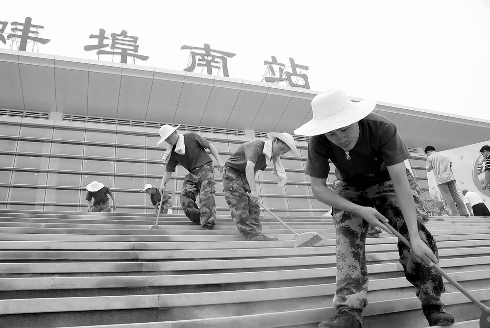 6月28日上午,解放軍汽車管理學(xué)院組織200余名官兵清掃高鐵蚌埠南站站前廣場(chǎng),為第二故鄉(xiāng)建設(shè)做貢獻(xiàn)。