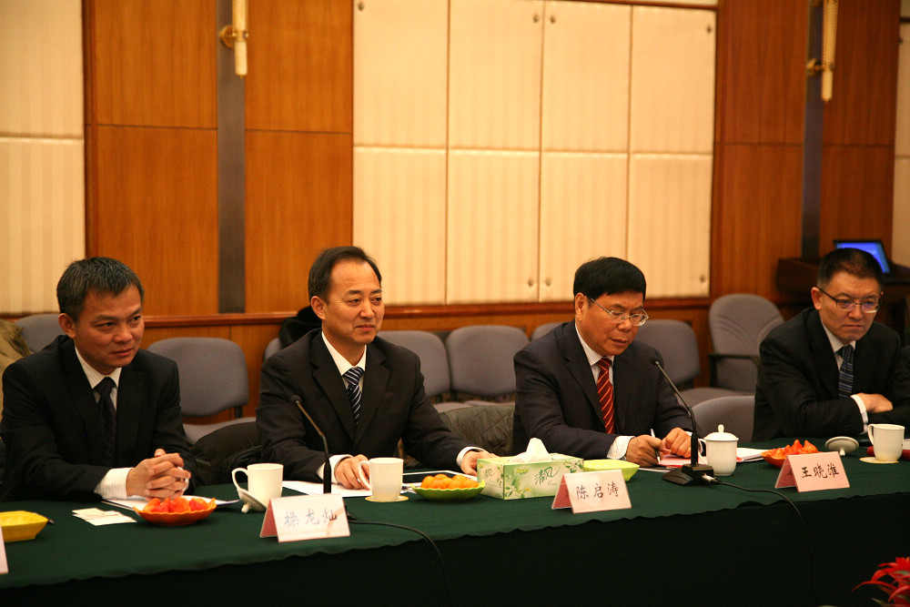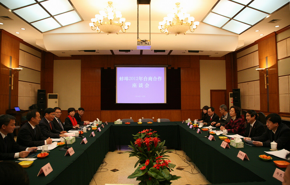 219,蚌埠2012年臺商合作座談會在北京臺盟中央會議室召開。全國政協(xié)常委、副秘書長、臺盟中央副主席黃志賢、臺盟中央有關(guān)部門負責同志,市領(lǐng)導陳啟濤、王曉淮、操龍燦出席座談會。座談會由王曉淮主持,黃志賢主席發(fā)表講話,陳啟濤致答謝詞并介紹蚌埠市情,蚌投集團作重點招商項目推薦。市招商局及公司有關(guān)負責同志參加座談會。