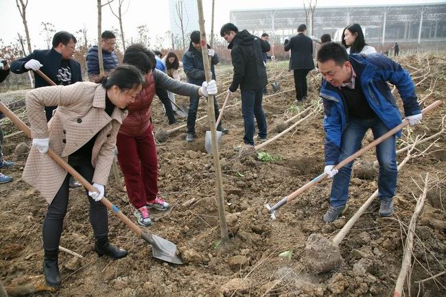 在技術人員的指導和示范下,大家一起行動,揮鍬鏟土、培實新土、扶苗踩壓……認真細致地做好一道道工序,現場呈現一片熱火朝天的景象.經過兩個小時的緊張勞動,共栽下近百顆樹苗。